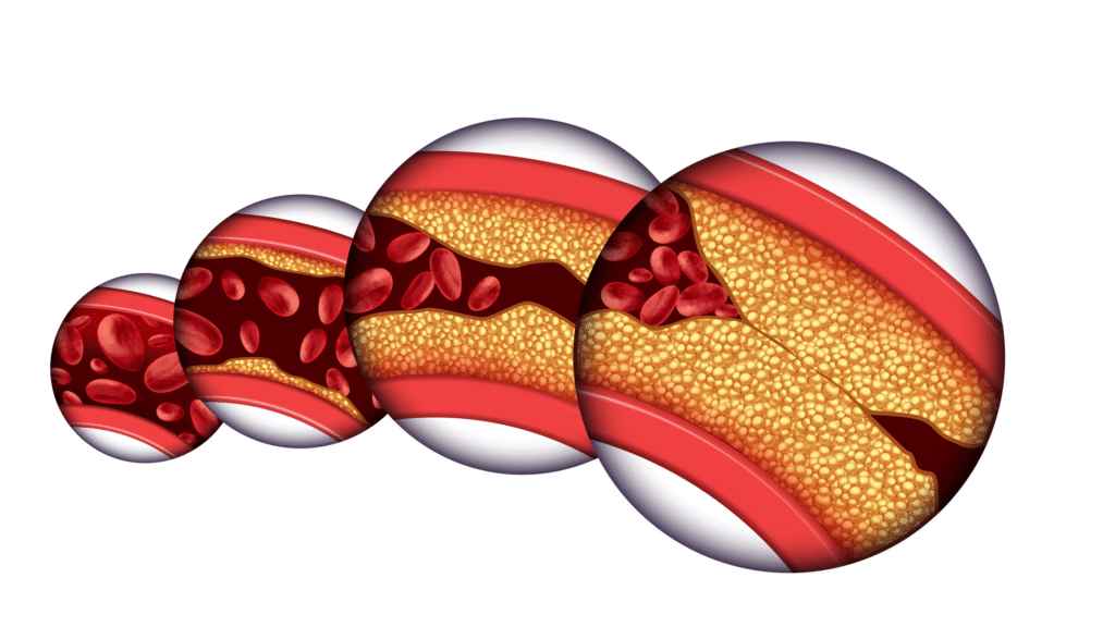 O excesso de gordura (LDL) se acumula nas paredes das artérias, formando placas que dificultam a passagem do sangue.